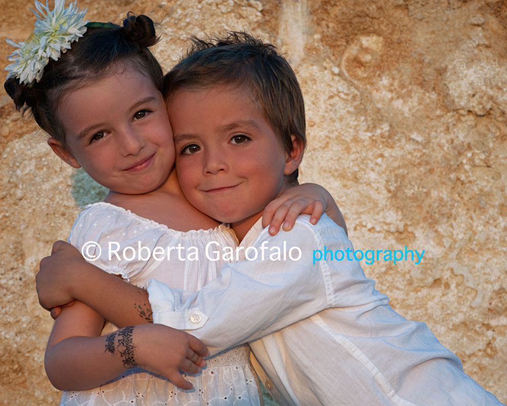 Per i genitori più fantasiosi, inventatevi una storia e rendeteli attori: questi bambini si sono fidanzati durante la loro estate ed hanno simulato fotograficamente il loro matrimonio, con tanto di cambio d’abito. Ed a tale proposito, come vestirli? Io adoro il bianco sempre ma in spiaggia ancor di piu’ (non si era capito, forse?) Caftani, parei bassi e arrotolati in vita sia per maschi che per femmine, vestitini leggeri di lino e svolazzanti di ruches. E non abbiate paura di farli entrare nell’acqua tutti vestiti: non ci sono immagini più belle e frizzanti di bambini vestiti ad hoc …..ma tutti bagnati o con le coscette nell’acqua e i vestiti appiccicati addosso!