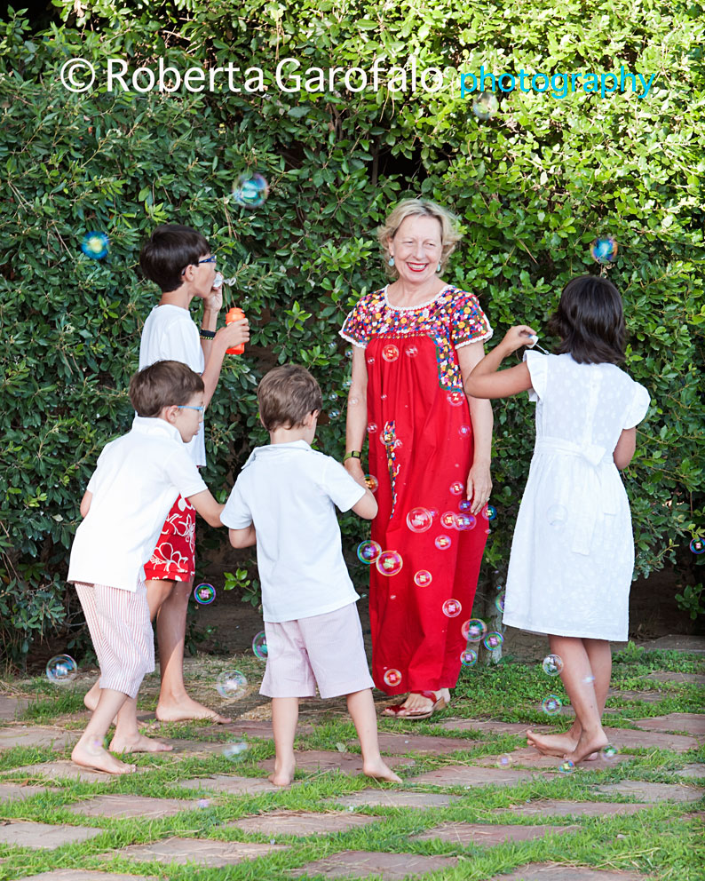 Il pomeriggio è corso via veloce, i 4 bellissimi nipoti all’inizio avranno pensato (come al solito) che gli era capitata una fotografa completamente pazza, che era arrivata con 5 confezioni di bolle di sapone per farci giocare la nonna, ma poi hanno partecipato volentieri aiutandomi a turno con l’assistenza. Ognuno aveva un compito e lo ha rispettato egregiamente: esposimetro, color checker, pannello riflettente, cambio obiettivi!
